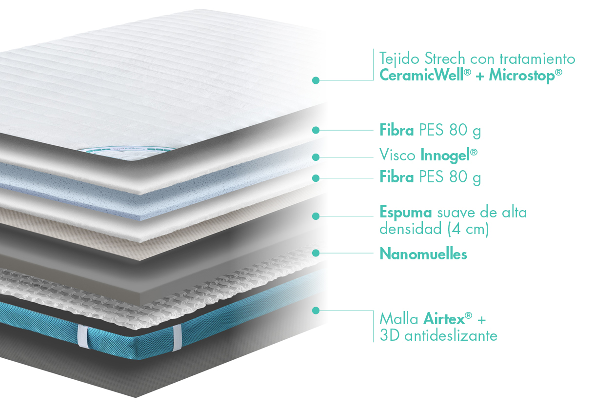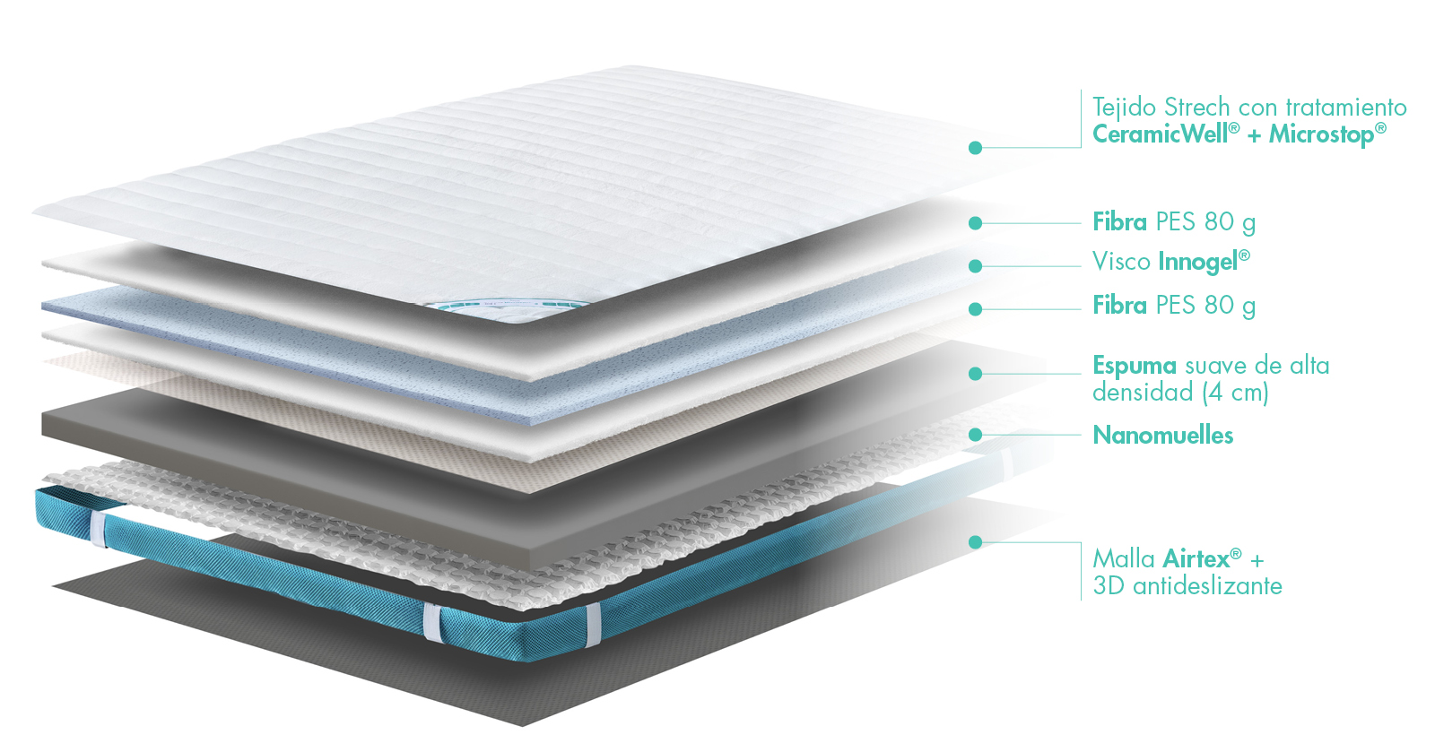 La superficie está compuesta por un tejido strech de alto gramaje para disfrutar del confort con dos tratamientos: CeramicWell®, que ayuda a la termorregulación corporal y a mejorar el metabolismo y la circulación sanguínea, y MicroStop®, que previene la aparición de ácaros y bacterias, ideal para personas alérgicas.